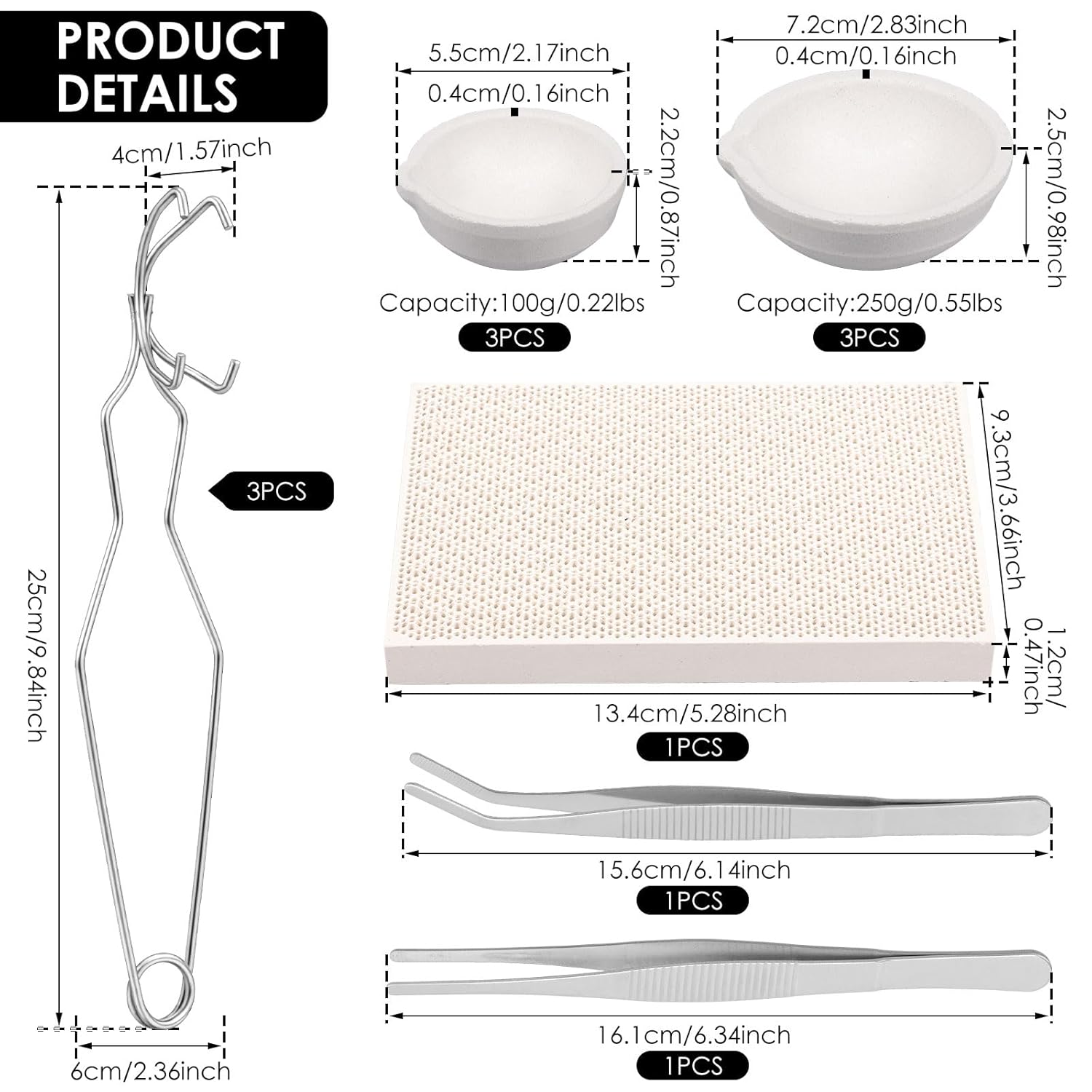 Product description Parts List:3 × Small Crucible3 × Large Crucible3 × Tong1 × Straight Tweezers1 × Curved Tweezers1 × Honeycomb PadDescription:This high purity fused quartz crucible kit (1500°C heat resistant) includes 6 dual capacity crucibles, plus 3 stainless steel crucible tongs, 2 tweezers (straight and curved tips) and 1 honeycomb pad, featuring an ergonomic pouring spout for melting metals and industrial use.Key Features:Ideal for various metals and alloys, this crucible kit is a must have for all casting needs.Specification:Material: Quartz, MetalDimensions:Small Crucible: 5.5 × 2.2 × 0.4 cm/ 2.17 × 0.87 × 0.16 inLarge Crucible: 7.2 × 2.5 × 0.4 cm/ 2.83 × 0.98 × 0.16 inTongs: 25 × 6 × 4 cm/ 9.84 × 2.36 × 1.57 inStraight Tweezers: Length 16.1 cm/ 6.34 inCurved Tweezers: Length 15.6 cm/ 6.14 inHoneycomb Pad: 13.4 × 9.3 × 1.2 cm/ 5.28 × 3.66 × 0.47 inNote:1. There may be slight differences between the picture and the actual color of the commodity. We will try our best to show you the exact color.2. Please allow slight dimension differences due to manual measurement. Manufacturer Contact Information DNAMYJME