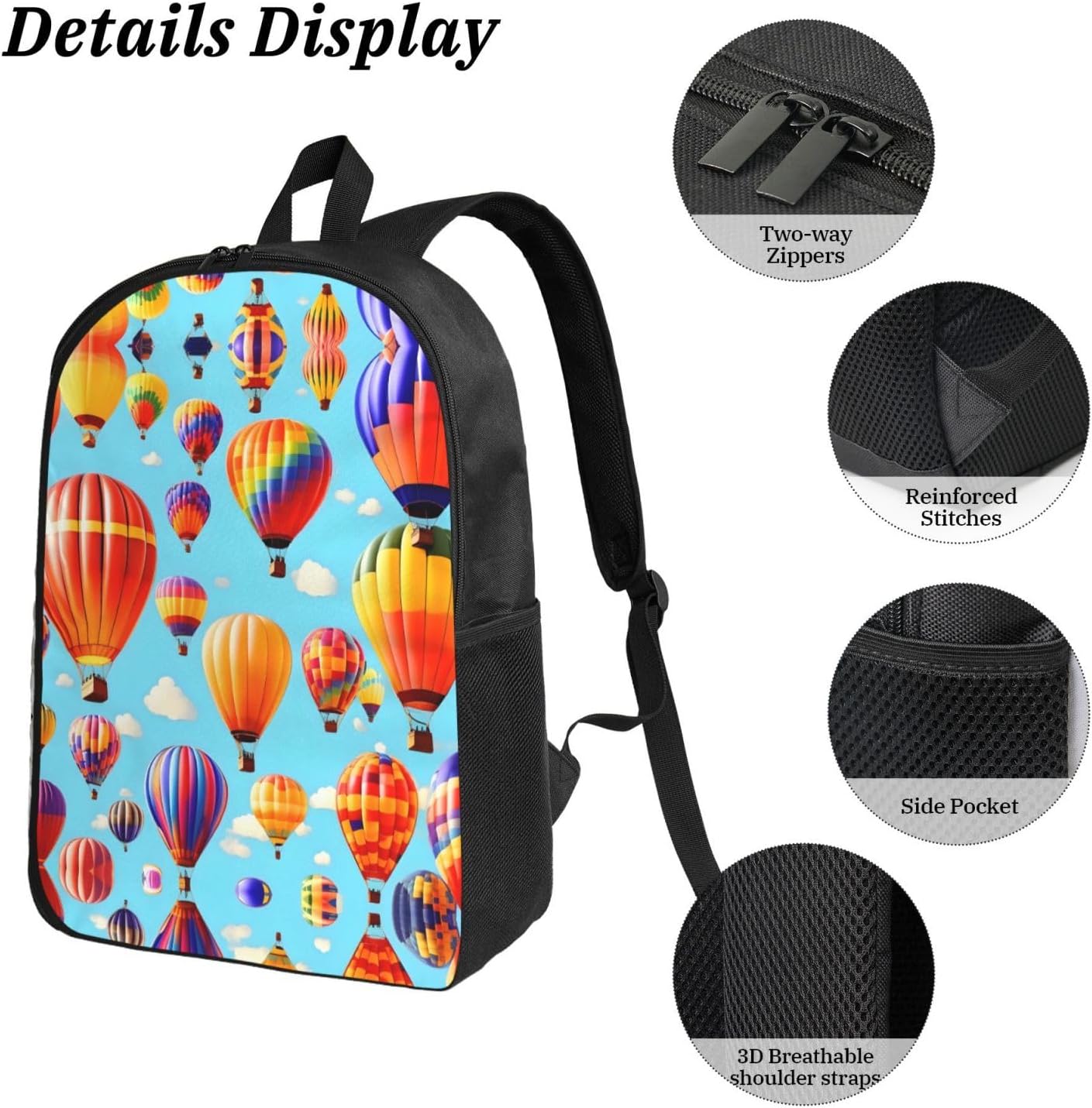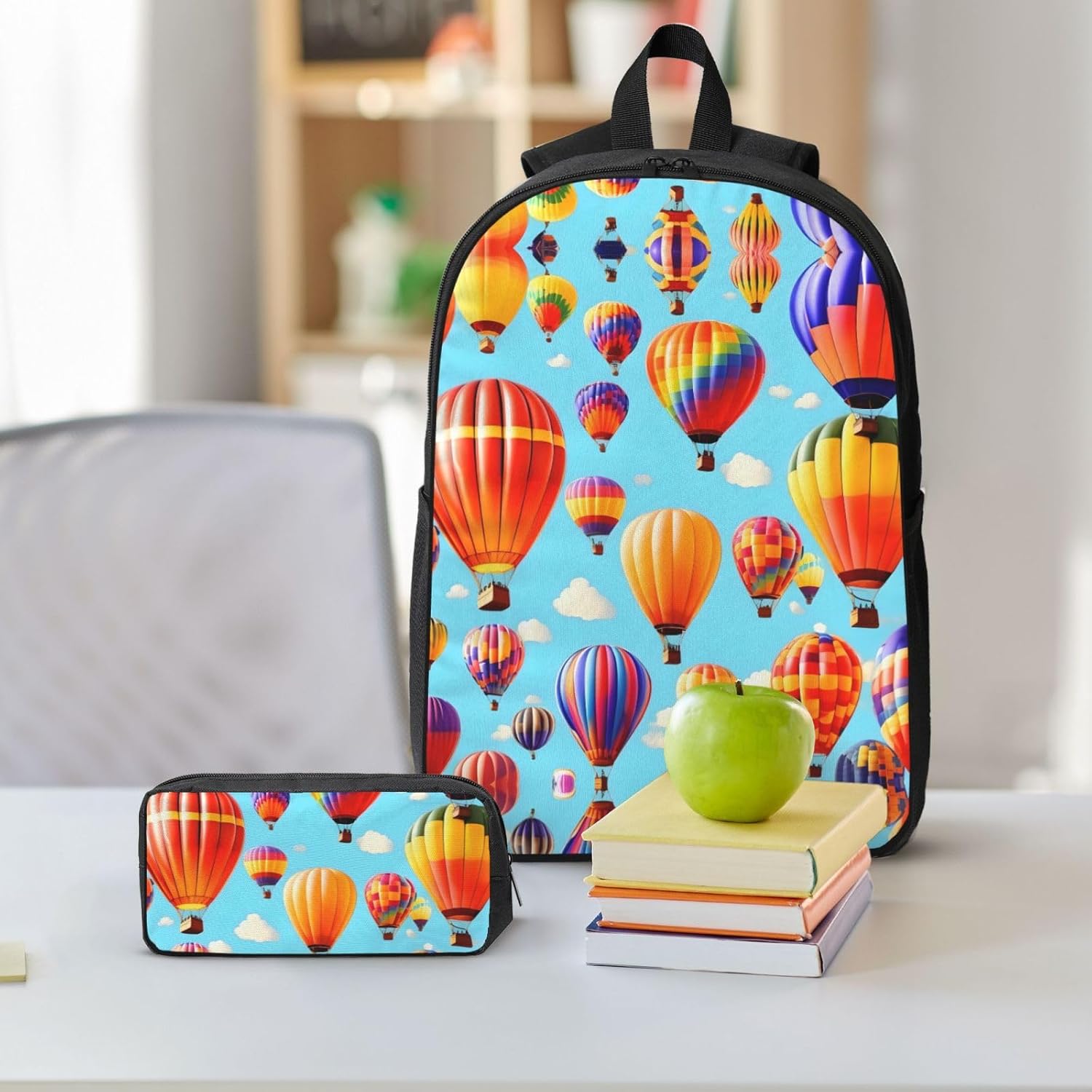 The Hot Air Balloons print Backpack with Lunch Bag, Pencil Case is made from robust Oxford fabric that provides a reliable and long-lasting performance for anyone who values functionality. The dimensions of the backpack (12.6x5.1x17 inches) allow for comfortable storage of your essentials, while the lunch bag keeps your food at the right temperature, perfect for day trips or outdoor activities. The pencil case offers a tidy solution for your writing materials, completing the set with added practicality and style for a variety of uses, from hikes to daily errands.