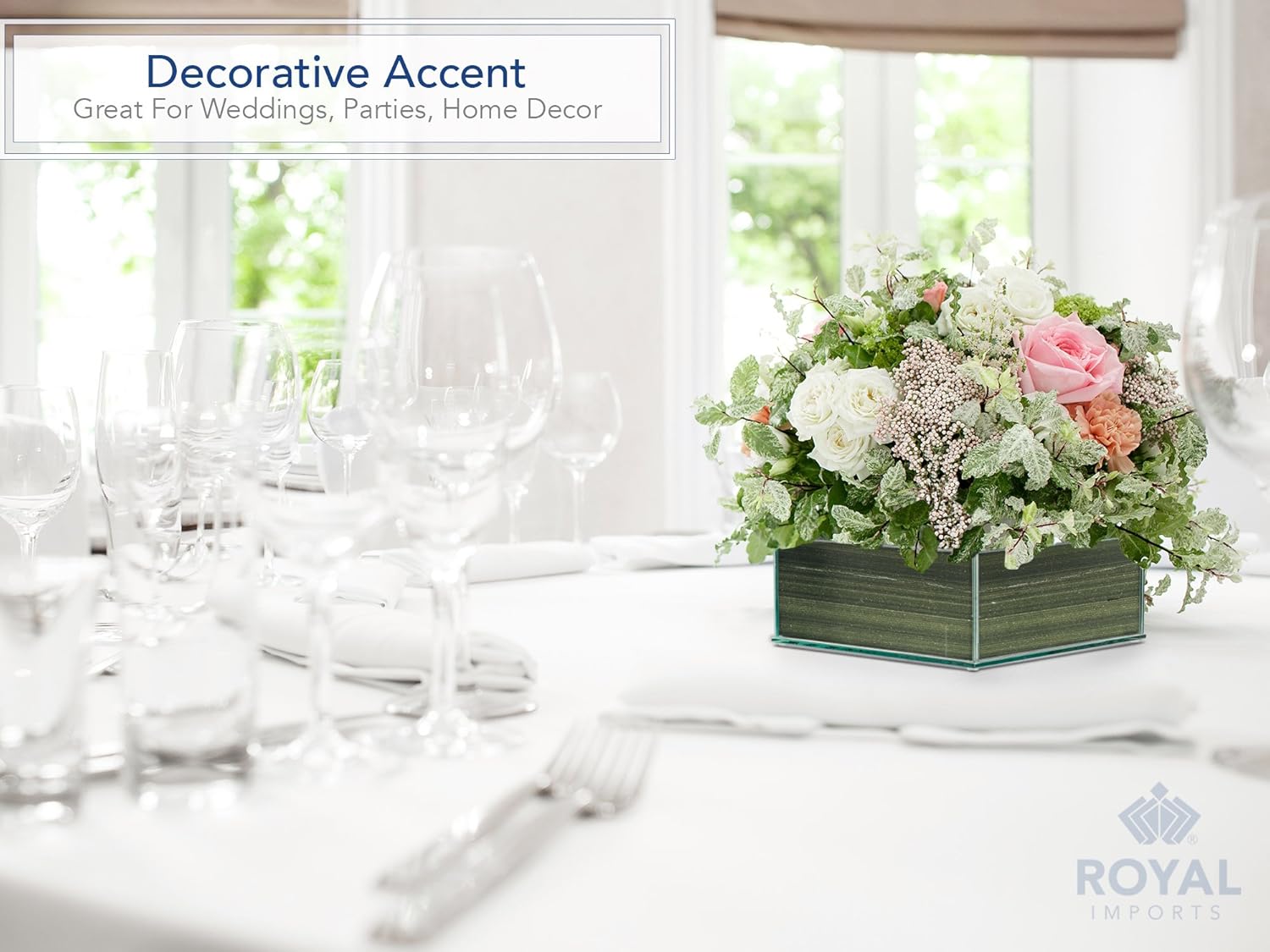 Decorate your home, office or special event with this clear glass low square vase by Royal Imports. This contemporary low glass planter is totally waterproof which means it can hold an unlimited amount of water without leaking. It is perfect for floating candles an succulents. Fill this modern glass mirror vase with flowers or lucky bamboo and enhance it with gems or lights to make an even brighter centerpiece.Royal Imports brings the highest quality glass vases to the floral and craft industry. Each square vase is crafted of quality thick plate glass thus creating a sleek, flawless centerpiece. Uses: floral arrangements lucky bamboo succulent plants candle holder silk arrangements Popular with: event planners florists interior designers restaurants home decorators