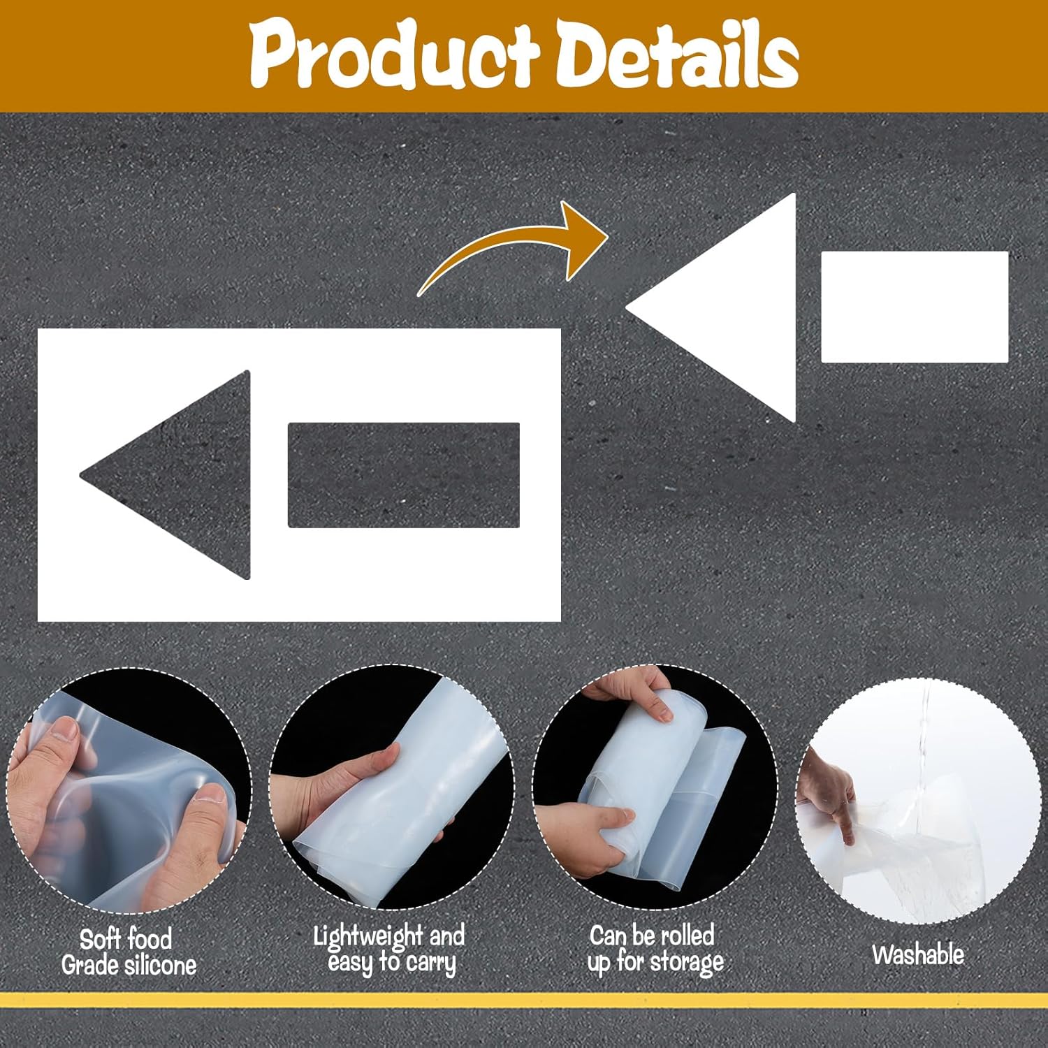 Features:Easy Storage & Reusable: The parking lot arrow and line templates can be easily folded and stored when not in use, making them convenient to transport and store. Their sturdy silicone material ensures they can be reused multiple times without degradation.Specification:Material: Food-grade siliconeSize: Straight arrow - Inner: 36" x 60", Outer: 44" x 68"Color: WhitePackage Includes: 1 silicone stencil
