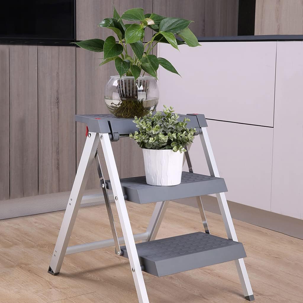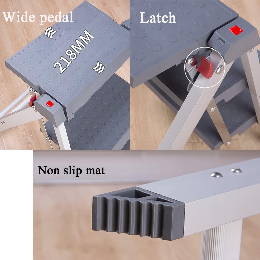 Name: Ultra-thin folding ladder stoolMaterial: aluminum alloyLoad-bearing grade: 150kgProduct classification: two-step ladder stool-nylon tread, three-step ladder stool-nylon treadLadder type: ladder stoolContents include: ladder x 1 (not including the pendulum)Applicable scenes: chairs, stools, ascent ladders, shelves, flower shelves, bookshelves, shoe racks, etc.Size: 2-step ladder: 40.8x43x38.6cm (16.1x16.9x15.2inch) 3-step ladder:40.8x59.2x55.7cm(16.1x23.3x21.9inch)This light folding ladder stool, nylon non-slip tread aluminum ladder, non-slip ladder feet pad, storage does not take up space, multi-purpose use, ascent, stool, shelf.High strength, light weightGirls carry and take no effort, weight easy to move, easy to ascend19.3cm golden step spacing, nylon insurance locking buckleOpen the ladder after the insurance buckle automatically lock press the insurance buckle can be folded closedPlacement, climbing a ladder multi-purposeDaily idle, placing greenery, books, etc., can also be used as a stool.Note tips.1, due to different light, monitor configuration, personal understanding of color, there are differences in color, to receive the goods in kind shall prevail.2, because the goods are measured manually, there will be 1-3cm error.