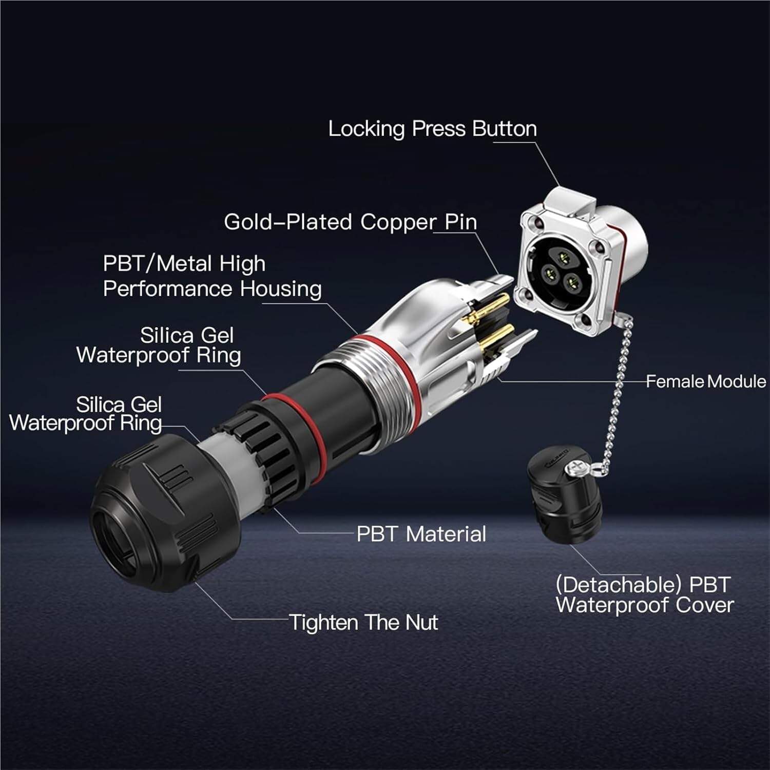 Connectors==========Model Number : BD-24Certification : CE,RoHS,UL,weeeContact resistance(Max.) : 1~5m omegaColor : SilverApproved : TUV UL CECable specification(2~4pin) : 2.5~4.0mm²/14~12AWGOperating voltage (AC.V.rms) : 250V~500VProtection level : IP68Current rating : 5A~25AInsulation resistance(Min.) : 500m omegaWorking temperature : -40 degrees Celsius~85 degrees CelsiusWithstanding voltage (AC.V)1 minute : 1500V~2000VAssembly style : SolderingDiameter range : 10.5~14.0mmType : Circular ConnectorCable specification(10~12pin) : 1.0~1.5mm²/18~16AWGCable specification(19~24pin) : 0.34~0.5mm²/22~20AWG